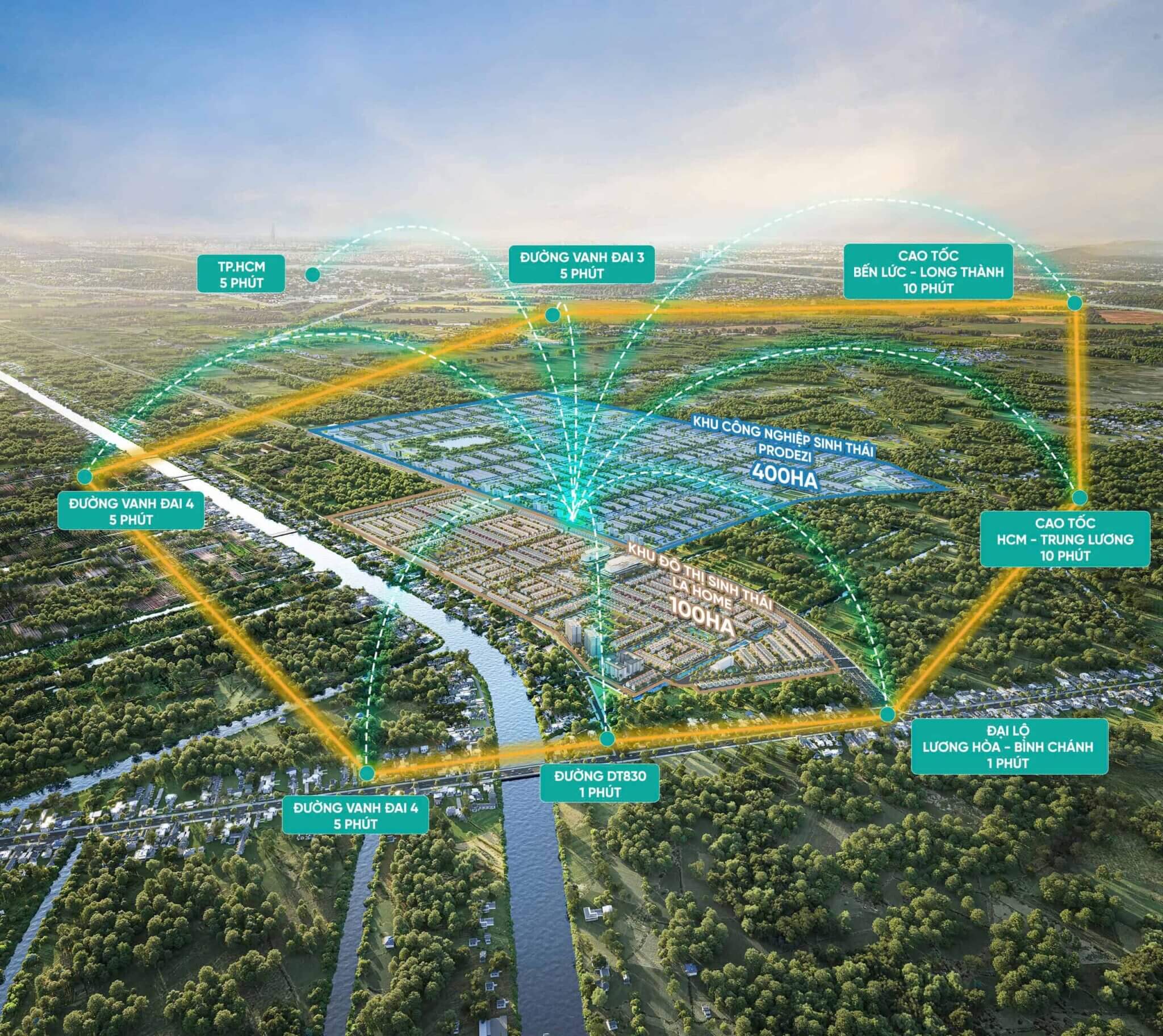 ホーチミン市中心地から約40km(60分)、隣接するビンチャイン区からはわずか4.5km(5分)と、都市圏へのアクセスも良好です。これにより、従業員の通勤やビジネス上の移動が非常に便利です。
